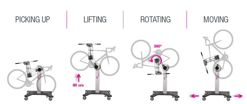 ・最大40kgの自転車ワークを、安全に昇降・回転・傾け・移動