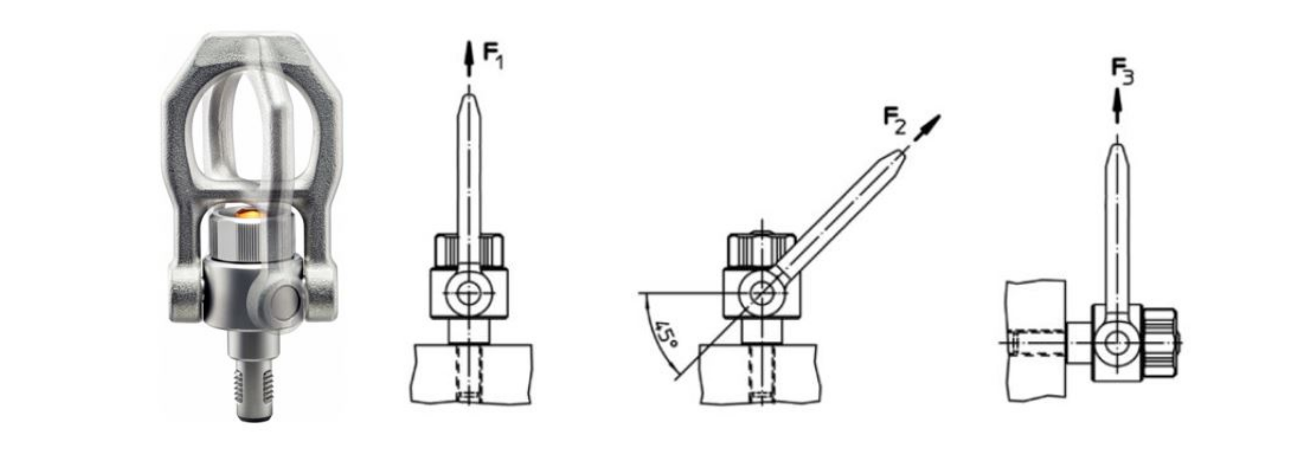 通常のアイボルトで横吊りをした場合に適切な角度にあわせて吊ることが難しく、ボルトの緩み・破損の危険がありました。スイベル式リフティングピンを使用すると、シャックルが360度回転するため適切な角度でワークを吊ることができます。