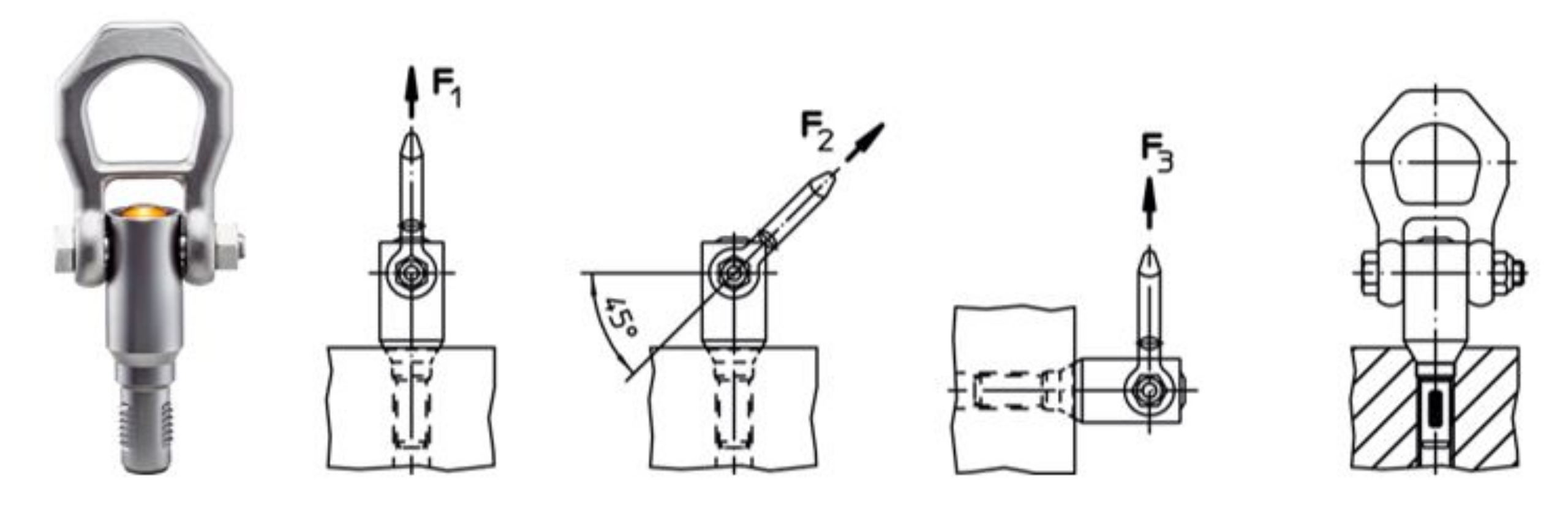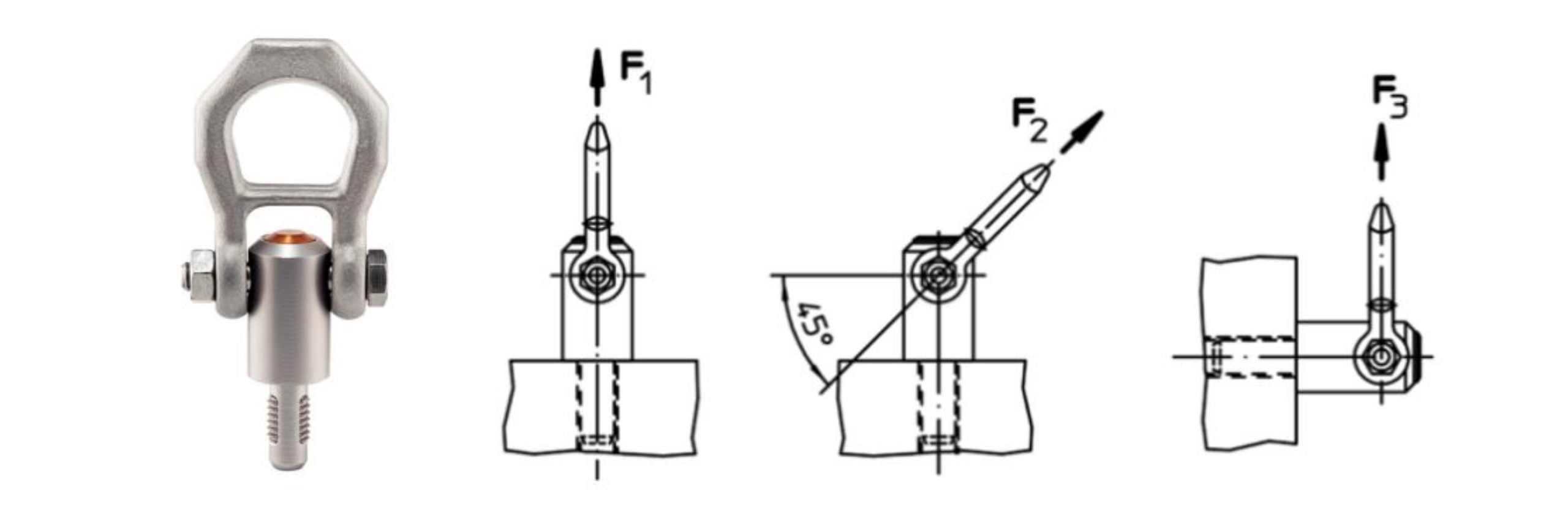 非鉄金属製のワークにリフティングを使用する場合には、使用者は使用前に耐荷重試験を行い安全に問題が無い事を確認する必要があります。金属以外、コンクリートや木製のワークにリフティングピンを使用する場合には、特別な専用ブッシュを使用しかつ使用者は使用前に耐荷重試験を行い安全に問題が無い事を確認する必要があります。