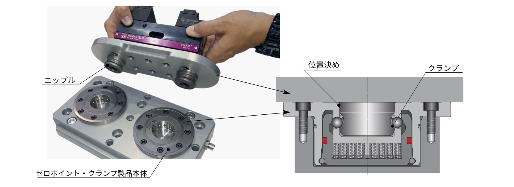 ゼロポイント・クランプとは、工作機械に設置するバイスなどのクランプ治具の位置決めとクランプ(固定)作業をワンタッチで行えるクランプ製品です。段取りの標準化ができるだけでなく、外段取りによって工作機械を効果的に利用し生産性を向上させることもできます。パレットクランプ、トップマウントモジュール、モジュラーゼロポイントとも呼ばれます。