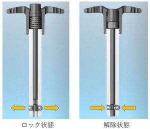 ボタンを押すとボール(鋼球)がピン内部に引き込まれロックが解除されます。ボタンを離すとボールがピンの外に出て再びロック状態になります。 |