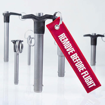 クイックリリースピン(Quick Release Pins)は、航空機を牽引する時にステアリングの油圧をオフにするレバーの固定に使用されるため、バイパスピン(Bypass Pins)とも呼ばれます。その他、インチサイズのボールロックピン(Ball Lock Pins)、RBFピン (remove before flight pins)、安全ピン(Safety Pins)、ロックピン(Lock Pins)、フライトピン(Flight Pins)とも呼ばれています。