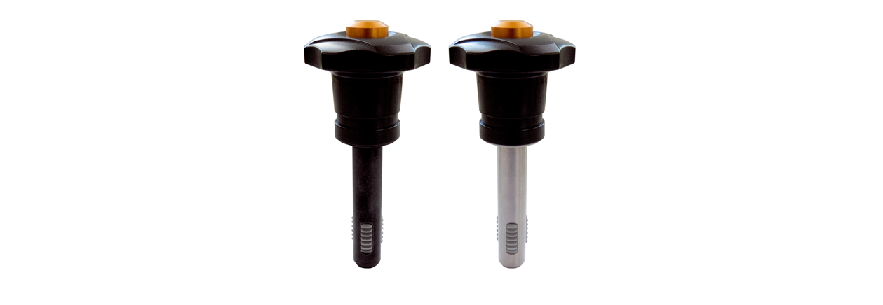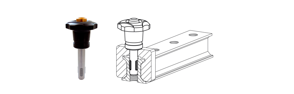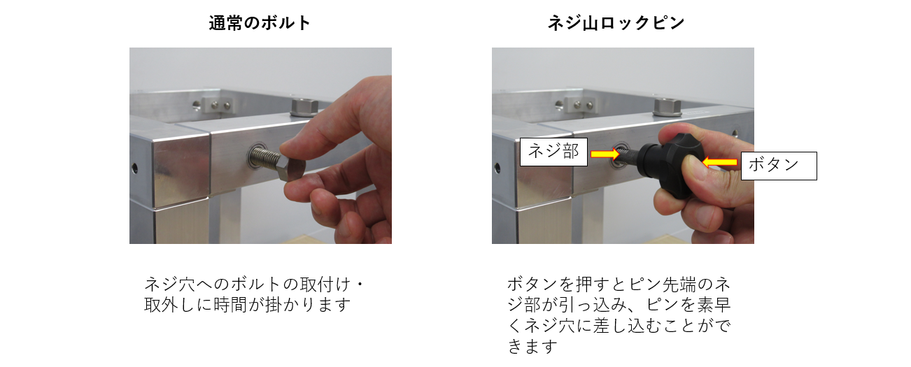 ネジ山ロックピンとは、ネジ穴を使ってワークをワンタッチで固定できるピンです。ピンのボタンを押しながらネジ穴に差し込み、離すとネジ穴をロックします。ネジ山ロックピンは横方向(せん断方向)の荷重を受ける用途に使用します。