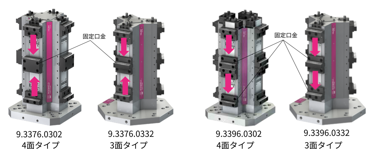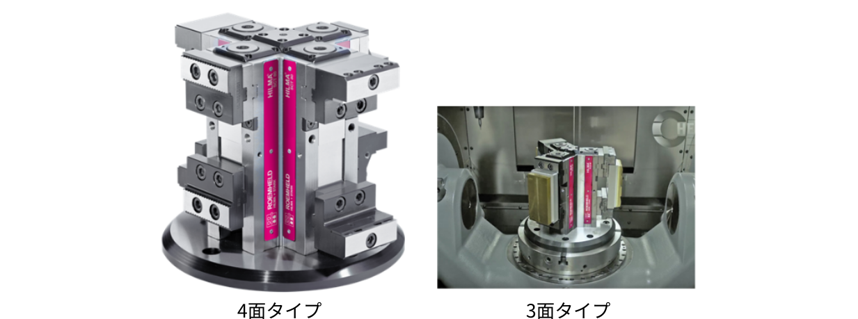 マシンバイスで高度な技術を持つロームヘルドグループ(Roemheld)のヒルマ(HILMA)が開発したタワー型バイスは横形の加工機向けに最適設計されていますが、無人化システムへ組み込まれた実績や、5軸加工機への採用実績もあります。テーブル回転時のワークと機械の干渉をさけるため、4面タイプの他、3面タイプもラインナップしております。